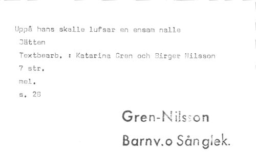 //// Uppå hans skalle lufsar en ensam nalle .lätten //// Textbearb. : Katarina Gren och Sirger Nilsson 7 str. mel. s. 28 //// Gren-Niis^on Barnv.o Sångiek.
