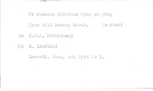 //// Ur svenska hjertens djup en Hysn till konung Oscar. //// Tx C..-'.A. Strandberg Lik O. Lindblad //// Lewerth, Gsma. och Nytt No ^ //// gång //// .^vartett