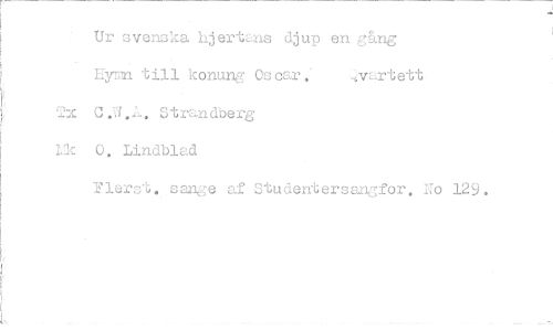 //// Ur svenska hjertans djup en gång Eyim till konung Oscar, vartett O .Yf. A, Strandberg 0. Lindblad //// Flerst. sange af Studenters migfor. No 129.