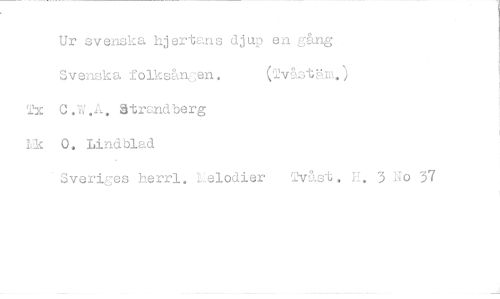 //// Ur svenska hjertans djup en g&ng Svenska folksången. (Tvåstäm.) //// Tx C . W.A, åtrsjrtdberg 1.1c 0. Lindblad //// Sveriges herrl. Lelodier Tv&st. E. 3 No 37
