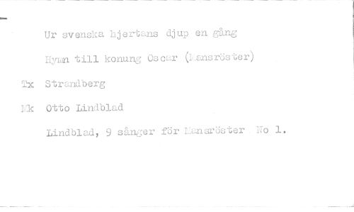 //// Ur svenska hjertans djup en gång Hymn till konung Oscar (i.sas röster) //// Tx Strandberg Ik Otto Lindblad //// Lindblad, 9 sånger för Mansröster No 1.