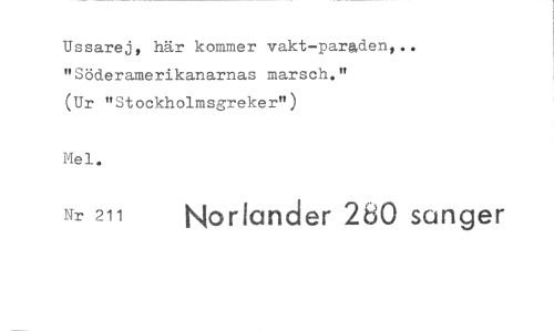 //// Ussarej, här kommer vakt-parg,d.en, .. "Söderamerikanarnas marsch." //// (Ur "Stockholmsgreker") //// Mel. //// Nr 211 Norionder 280 sanger