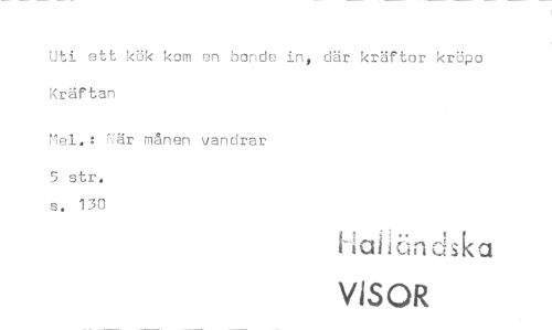 //// Uti ett kök kom en bonde in, där kräftor kröpo Kräftan //// Mel.: f'är månen vandrar //// 5 str. s. 130 //// i iaiiändska //// Vis OR