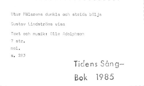 //// Utur t-lälarens dunkla och strida bölja //// Gustav Lindströms uisa //// Text och musik: Olle Adolphson 7 str, mel, s. 283 //// Bok 1985