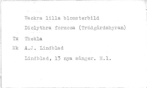 //// Vackra lilla blomsterbild Diclythra formosa (Trädgårdshyran) //// Tx Thekla Mk A.J. Lindblad //// Lindblad, 13 nya sånger, H.l.