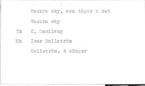 //// Vackra sky, som tågar i det Vackra sky Tx C. Snoilsky Mk Ivar Hallström //// Hallström, 4 sånger