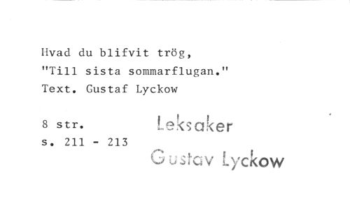 //// Hvad du blifvit trög, //// "Till sista sommarflugan." //// Text. Gustaf Lyckow //// s str. Leksaker //// s. 211 - 213 //// Gustav Lyckow