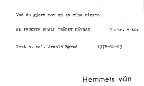 //// Vad du gjort mot en av mina minsta //// PÅ FRUKTEN SKALL TRÄDET KÄNNAS 2 str. + //// Text o. mel. Arnold B%rud 1978-08-03 //// Hemmets vän