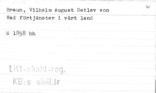 //// Braun, Vilhelm August Detlev von Vad förtjänster i vårt land //// E 1858 hh //// Utt-ska^-retj. //// KB:s skiuLtr
