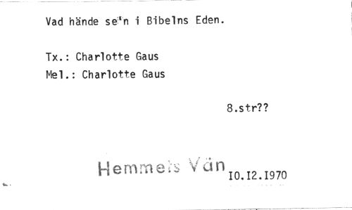 //// Vad hände se'n i Bibelns Eden. //// Tx.: Charlotte Gaus Mel.: Charlotte Gaus //// 8.str?? //// Hemmet Van //// 10.12.1970