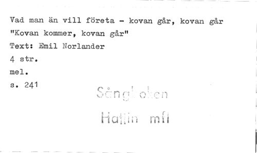 //// Vad man än vill företa - kovan går, kovan går "Kovan kommer, kovan går" //// Text: Emil Norlander //// 4 str. //// mel. //// s* 241 t s //// v/finc' o.' en //// Haljn mii