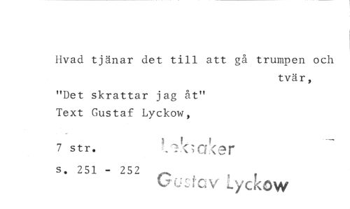 //// Hvad tjänar det till att gå trumpen och //// tvär, //// "Det skrattar jag åt" //// Text Gustaf Lyckow, //// 7 str.