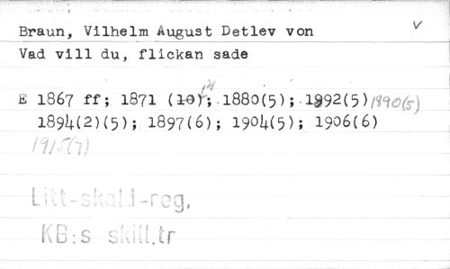 //// Braun, Vilhelm August Detlev von //// Vad vill du, flickan sade //// E 1867 ff; 1871 (W; 1880(5); 1992(5 1894(2)(5); 1897(6); 1904(5); 1906(6)