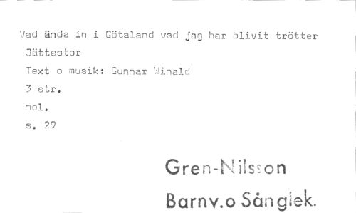 //// Vad ända in i Götaland vad jag har blivit trötter Hättestor //// Text o musik: Gunnar Winald 3 str, mel. s. 29 //// Gren-N iisson Barnv.o Sångiek.