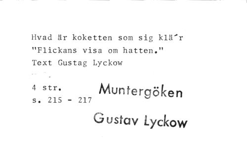 //// Hvad är koketten som sig klä^r "Flickans visa om hatten." //// Text Gustag Lyckow //// 4 str. Munfergöken //// s. 215 - 217 //// Gusfay Lyckow