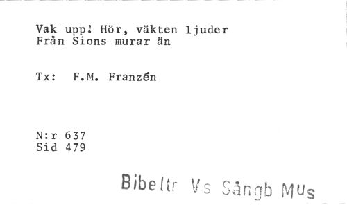 //// Vak uppl Hör, väkten ljuder Från Sions murar än //// Tx: F.M. Franzén //// N:r 637 Sid 479 //// Bibehr Vs Sångb M"s