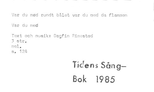 //// Var du med rundt bålet var du ned da flammen Var du med //// Text och musik: Dagfin Rimestad 3 str, mel. s. 124 //// Tidens Sång- //// Bok 1985