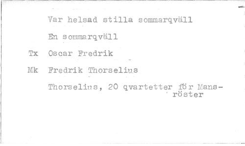 //// Var helsad stilla sommarqväll //// En sommarqväll //// Tx Oscar Fredrik //// Mk Fredrik Thorselius //// Thorseliws, 20 qvartetter R)r Mansröster