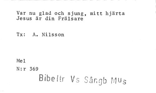 //// Var nu glad och sjung, mitt hjärta Jesus är din Frälsare //// Tx: A. Nilsson //// Mel //// N:r 369 //// Bibeftr Vs //// Sångb
