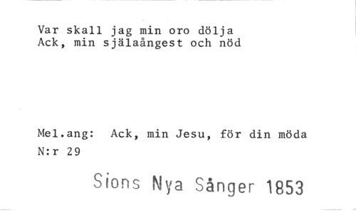 //// Var skall jag min oro dölja Ack, min själaångest och nöd //// Mel.ang: Ack, min Jesu, för din möda N:r 29 //// Sions Nya Sånger 1853