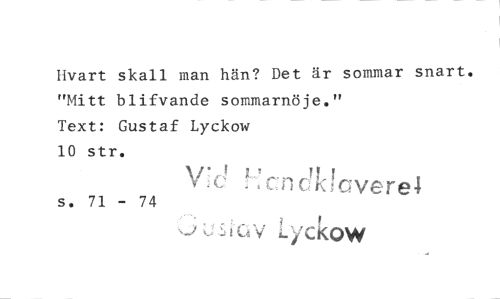 //// Hvart skall man hän? Det är sommar snart. "Mitt blifvande sommarnöje." //// Text: Gustaf Lyckow 10 str. //// V €' h c n cf!dcvere4 //// s. 71 - 74 //// Lyckow