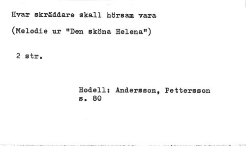 //// Hvar skräddare skall hBrsam vara (Melodie ur "Den sköna Helena") //// 2 str. //// Hodell: Andersson, Pettersson s. 80