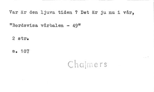 //// Var är den ljuva tiden ? Det är ju nu i vår, "Bordsvisa vårbalen - 49" //// 2 str^ s. 187 //// Cho^ers