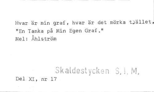 //// Hvar är min graf, hvar är det mörka tjället "En Tanka på Min Egen Graf." //// Mel: Åhlström //// Skatdestycken S, i.M, //// Del XI, nr 17
