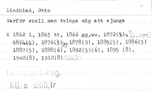 //// 4 //// ^ i //// Lindblad, Otto //// Varför skall man tvinga mig att sjunga //// E 1862 1, 1863 tt, 1866 gg,uu, l872(5J^^,^.7^< 18744^), 1876(5)^1878(9), 1885(5), 1886(5) 1887(5), 1888(6), 1892(5)(6), 1895 (S), //// 19o2(8), 1910(8). . //// -reg, //// KB;S skiLLtr