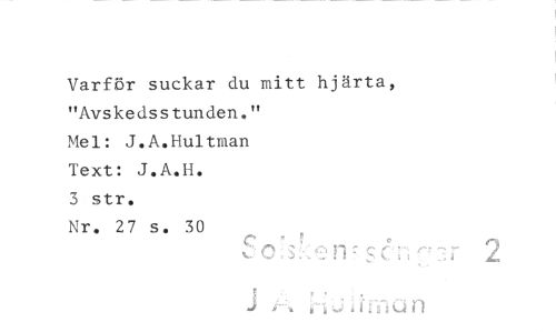 //// Varför suckar du mitt hjärta, "Avskedsstunden." //// Mel: J.A.Hultman Text: J.A.H. //// 3 str. //// Nr. 27 s. 30 //// ^ t"! ^ <i); s s Q H