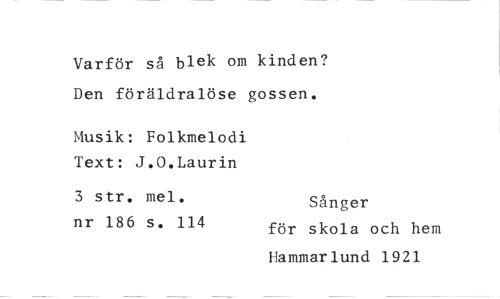 //// Varför så blek om kinden? Den föräldralöse gossen. //// Musik: Folkmelodi Text: J.O.Laurin //// 3 str. mel. nr 186 s. 114 //// Sånger för skola och hem Hammarlund 1921