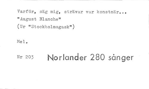 //// Varför, säg mig, strävar var konstnär... "August Blanche" //// (Ur "Stockholmsgask") //// Mel. //// Nr 203 Nortander 280 sånger