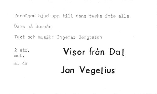 //// Varsågod bjud upp till. dans tveka inte alls Dans på Sumås //// Text och musik: Ingemar Bengtsson //// 2 str. Visor från Da [ //// mel. s. 46 //// Jan Vegetius
