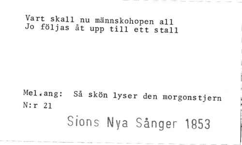 //// Vart skall nu männskohopen all Jo följas åt upp till ett stall //// Mel*ang: N:r 21 //// Så skön lyser den morgons t j em //// Sions Nya Sånger 1853