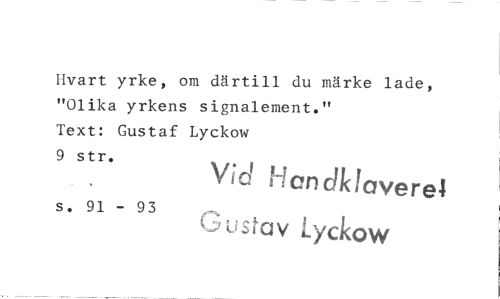 //// Hvart yrke, om därtill du märke lade, "Olika yrkens signalement." //// Text: Gustaf Lyckow 9 str. //// Y?Q Hcnc^fayerel //// s. 91 - 93 ^ //// Uusfav Lyckow