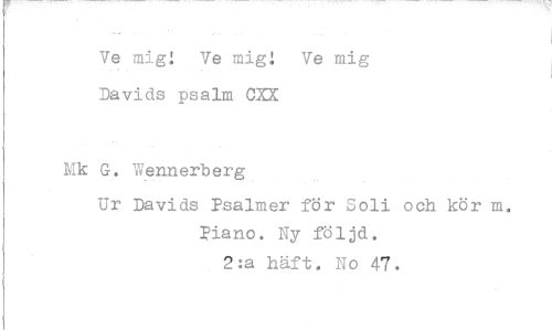 //// Ve mig! Ve migj Ve mig //// Davids psalm CXX //// Mk G. Wennerberg //// Ur Davids Psalmer för Soli och kör m. Piano. Ny följd. //// 2:a häft. No 47.