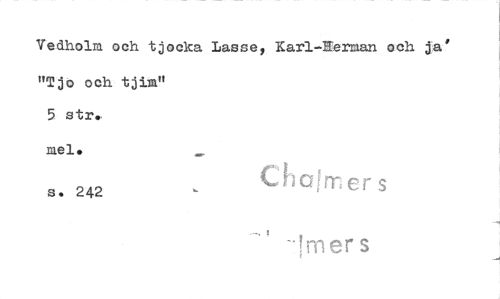 //// Vedholm och tjocka Lasse, Karl-Heman och ja* "T jo och tjim" //// 5 str. mel. //// s. 242 //// "jniers