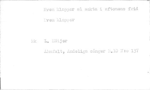 //// Hvem klappar så sakta i aftonens frid Lvem klappar //// L, Höijer //// Almfelt, Andeliga sånger H.10 N:o 137