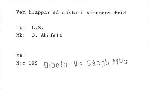 //// Vem klappar så sakta i aftonens frid //// Tx: L.S. //// Mk: O. Ahnfelt //// Mel //// N:r 195 gjbettr Vs Sangb