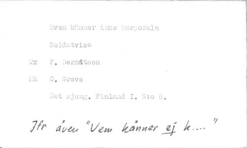 //// hvem känner icke korporaln //// Soldatvisa 'Jx F. Jern^tson i .k 0. Greve //// Det sjung. Finland I. N:o 8. //// 7^ ^