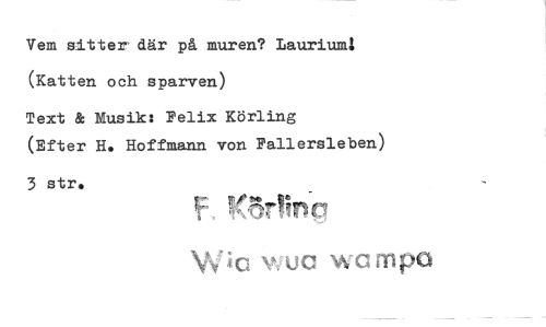 //// Vem sitter där på muren? Lauriumi //// (Katten och sparven) //// Text & Musik: Felix Körling (Efter H. Hoffmann von Fallersleben) //// 3 str. //// wuo wompo