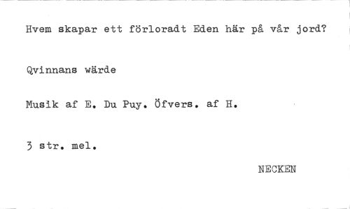 //// Hvem skapar ett förloradt Eden här Qvinnans wärde //// Musik af E. Du Puy. öfvers. af H. //// 3 str. mel. //// på vår jord? //// NECKEN