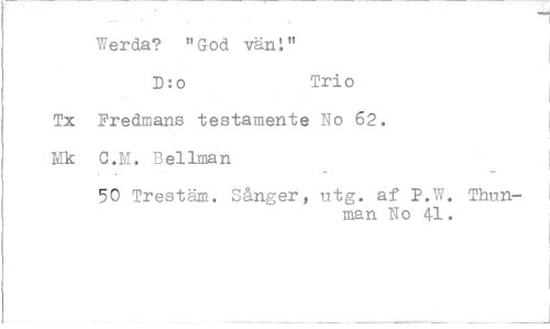 //// Werda? "God väni" //// D:o Trio //// Tx Fredmans testamente No 62. //// Mk C.H. Bellman //// 50 Trestäm. Sånger, utg. af P.W. Thun- //// man No 41.
