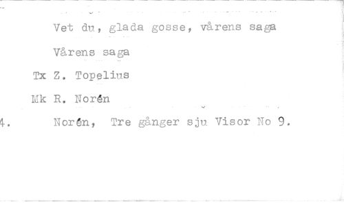 //// Vet du, glada gosse, vårens sa^ Vårens saga Tx Z. Topelius Mk R, Norén 4. Norén, Tre gånger sju Visor No 9.