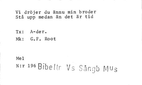 //// Vi dröjer du ännu min broder Stå upp medan än det är tid //// Tx: A-der. //// Mk: G.F. Root //// Mel //// 19'BibeHr Vs Sångb MUg
