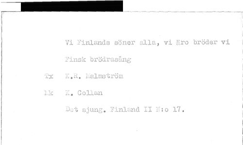 //// i'X //// Vi Finlands söner alla, vi äro bröder vi Finsk brödrasång K.R. Kalmström K. Collan //// Do*t sjung. Finland II 11:o 17.