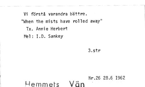 //// Vi förstå varandra bättre. //// "Mhen the mists have rolled away" Tx. Annie Herbert Mel: I.D. Sankey //// 3.str //// Nr.26 28.6 1962 //// Hemmets Vän