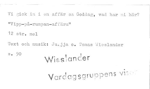 //// Vi gick in i en affär sa Goddag, vad har ni här? "V ipp-på-rumpan-af färn" //// 12 str. mel //// Text och musik: Ju*jja o. Tomas Wieslander s. 90 , ! //// Wiesiancer //// Vardcgsgruppens vr
