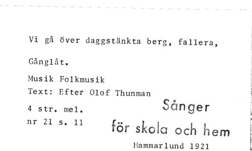 //// Vi gå över daggstänkta berg, fallera, //// Gånglåt. //// Musik Folkmusik //// Text: Efter Olof Thunman //// 4 str. mel. Sån Qe T //// 2' s- n för skota och hem //// Hammarlund 1921