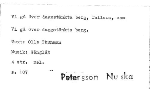//// Ti gå över daggstänkta berg, fallera, som //// Vi gå över daggstänkta berg. //// Text: Olle Thunman Musik: Gånglåt //// 4 str. mel. //// s. 107